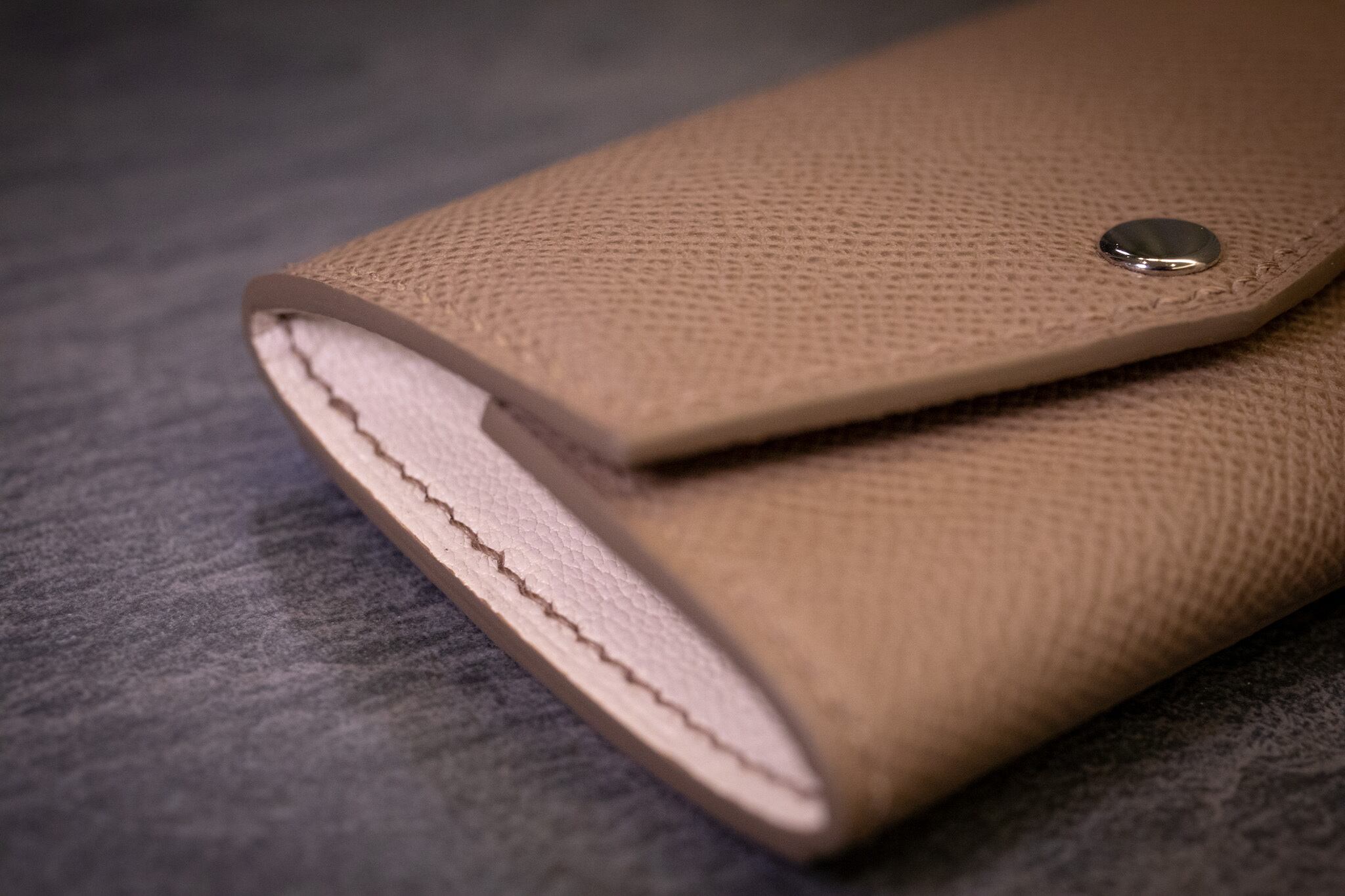 外装には型押しカーフレザー「エプソン」のエトゥープを使用。